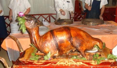 將即將臨盆的母羊投入炭火中燒烤,當炭火將母羊全身烤熟之後開膛破腹把乳羊取出,據說是皮酥肉嫩,味道鮮美。
