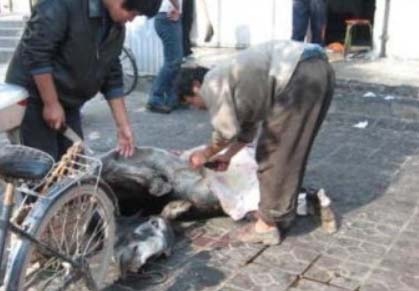 這道菜也是和驢過不去,活驢固定好,旁邊有燒沸的老湯。食用者指定要吃某一部份,廚師剝下那一塊的驢皮,露出鮮肉。用木杓舀沸湯澆那塊肉,等澆得肉熟了再割下來,裝盤上桌。