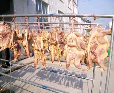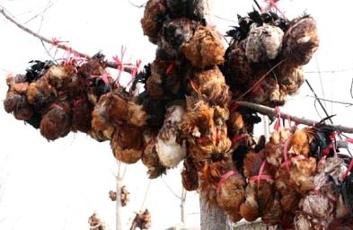 做這種東西時,需要一定的手法速度必須非常快。這是藏菜,大師以極快的速度拔毛、取髒、填調料入雞腹、縫上、掛於通風處(未放血殺死)。這時雞必須還是活的,然後如風鈴一般在風雪之中「咕咕」直叫,其景慰為壯觀。