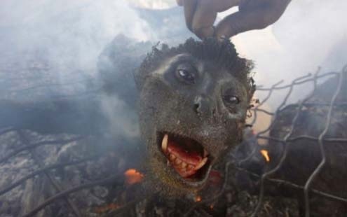 猴兒的頭頂從小洞中伸出,用金屬箍住,並且箍的非常緊,用小錘輕輕一敲,頭蓋骨應聲而落。猴的腦部就完全裸露在食客們的面前。這時,有較饞嘴一些的人,已經用湯匙伸向紅白相間的猴腦,隨著桌下垂死猴子一聲慘叫,拉開了生食猴腦慘狀的序曲。